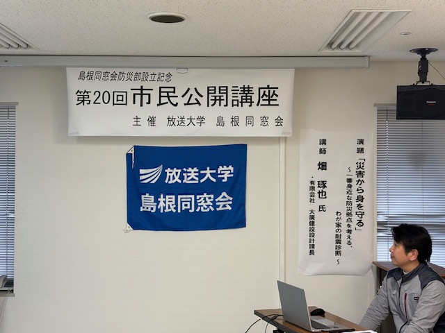島根同総会防災部設立記念として、2026年2月7日(土)13:30から、島根学習センター3階「第1講義室」において第20回市民公開講座を開催しました。 講師には有限会社大廣建設設計課長 畑 琢也氏と同社 設計課 岸本峻介氏を迎え